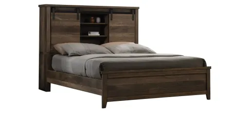 The Calhoun Queen Bookcase Bed is perfectly on-trend with its sliding barn door features in a in rustic light brown. The headboard offers two hidden sections behind sliding doors and a center section with shelves.