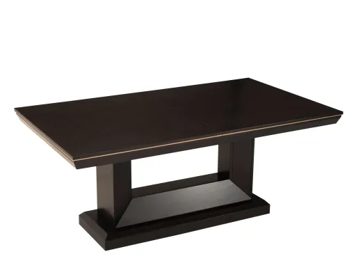 The Callister dining table accomplishes a sleek, contemporary look while managing to remain timeless. Its chocolate finish presents itself beautifully in any space. An 18-inch extension leaf makes hosting guests convenient, and the table's pedestal base not only looks fabulous, but provides a sturdy foundation for quality family time. Matching Table Protector