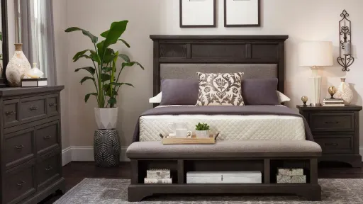 If you need storage, but don't want to sacrifice on style, then consider the Cambridge king 4-pc. bedroom set. With an upholstered headboard and upholstered bench-style footboard, this bed is different from anything you've even seen before. Plus, the footboard features 3 storage compartments to store extra blankets, sheets or pillows! Need more storage? No problem. The dresser has 7 drawers and the nightstand has 2 drawers.