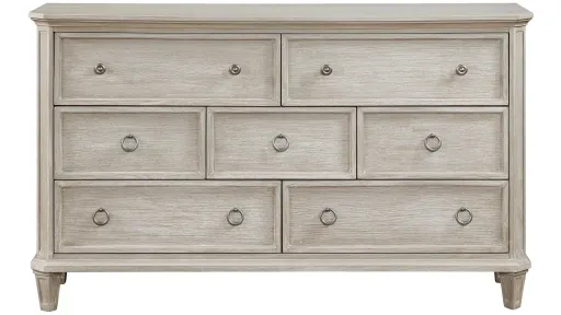 In a modern look on traditional design, the Cameo Dresser combines refined lines with classic accenting to create an elegant statement for your bedroom. Clipped corners define the profile of the dresser while picture frame molding lends detail to the fronts of each drawer, and pilasters. Weathered nickel ring pull hardware centers the drawers with the dresser also featuring knob hardware on the top drawers. The oak veneer of the collection is finished in light brown.