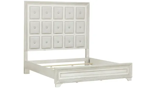 Camila Upholstered Bed is simply stunning, showcasing a regal presence that creates an impressive focal point. Individually framed upholstered panels trimmed with rosettes complement the semi-transparent creamy white finish on swirly ash veneers. Silver-tipped intricate molding frames the piece in shimmering elegance. This bed is elevated on bracketed feet and uses a bolt-together construction, ensuring safety and stability.
