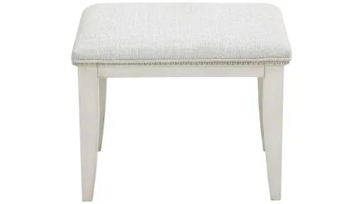 Vintage and inviting, the Camila Vanity Stool has silver-tipped intricate egg-and-dart molding beneath the welted seat cushion, upholstered in a soft cream texture. The semi-transparent creamy white finish enhances the distinctive swirly ash veneer construction of the base and legs. The perfect complement to the Camila Vanity.