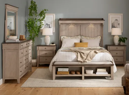 Ground your sleeping quarters with the warm authenticity of the Campbell 4-pc. mantel bedroom set. Designed to bring an architectural presence to the room, the bed serves as a commanding focal point, while the nine-drawer dresser, mirror, and nightstand round out this beautifully functional group. A striking addition to rustic, farmhouse, or traditional interiors, the Campbell collection is crafted from solid wood with time-honored mortise and tenon joinery, pin nailhead trim, and a distressed finish for cozy and elegant ambiance.