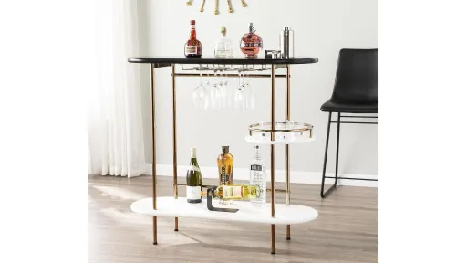 Wine and dine in style with this Cannock Wine/Bar Table. An elongated tabletop provides plenty of space for mixing drinks, while the white and black finish adds a modern feel to your dcor. Four glassware racks and two open shelves organize stemware, spirits, and mixers, keeping your entertaining space neat and tidy.