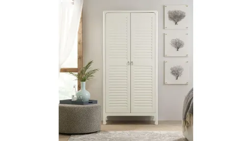 Designed to create a comfortable and inviting retreat within the home, the Cape May Wardrobe is defined by its casual finishes and variety of organic textures and materials that combine to deliver a relaxed aesthetic. Inspired by casual, waterfront living, the collection was designed to bring the relaxed aura of the outside in. White oak veneer delivers two key finishes, a whitewashed look and a weathered gray and is accented with sand blasted pine and soft white bronze metal details. Hooker Furniture offers full height, full depth and full width drawers for maximum storage capacity. All drawers have strong, time-tested English or French dovetail construction, for years of problem-free use.