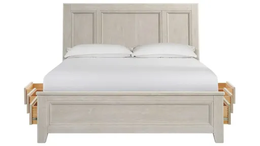 austen white king wood & upholstered platform canopy bed with side storage | poster | drawers