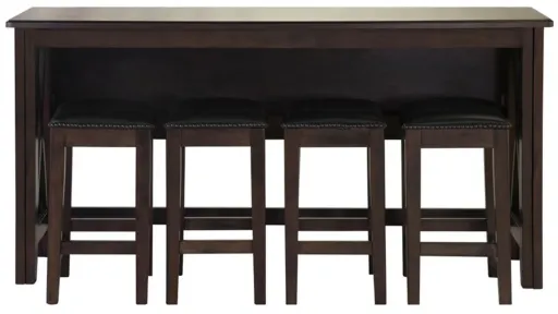 Carmina Counter Height Table and Four Stools - the perfect blend of style, functionality, and versatility for your dining space. Crafted with meticulous attention to detail, this remarkable set combines contemporary design with practical features to enhance your dining experience. The centerpiece of this set is the Carmina Counter Height Table, designed to impress. Its sleek and modern silhouette is complemented by a stunning drop leaf feature, allowing you to effortlessly expand the seating capacity from four to a generous eight people. Whether you're hosting a cozy dinner with friends or a lively gathering with extended family, this table effortlessly adapts to accommodate everyone. The Carmina Counter Height Table boasts two convenient drawers, providing ample storage space for your dining essentials. With smooth ball bearing guides, accessing and organizing your cutlery, napkins, or placemats has never been easier. Say goodbye to cluttered surfaces and embrace a more organized dining area.