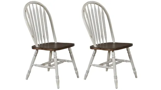 The Carolina Crossing Windsor side chair in white. Crafted of rubberwood solids, this piece features a two-toned white and honey finish, nylon chair glides to protect your flooring, and is anchored by turned splayed legs. This chair is available in multiple finishes and the heavy distressing translates well into any decor.