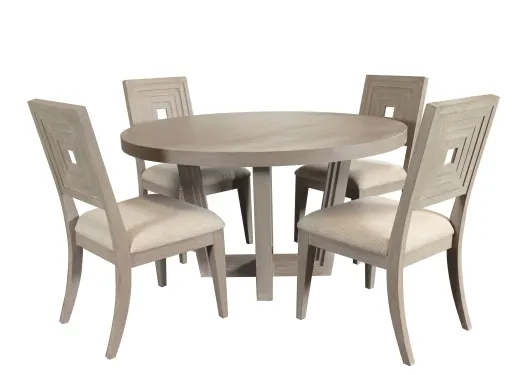 This beautiful farmhouse inspired dining set features a pedestal table base in warm neutral finish. It is ideal for small dining spaces and adds a contemporary feel to your space. With cottage design in fashion, this beautiful chair pairs well with the Cascade dining table.