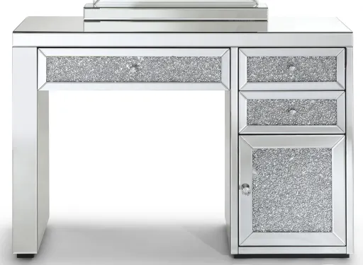 Cassie Vanity Table Features Beveled Mirror Surface, Faux Glass Diamond Inserts and Crystal Pulls. 3 Full Extension Drawers are included with 1 Soft Close Door. Matching Mirror is Available is Sold Separately