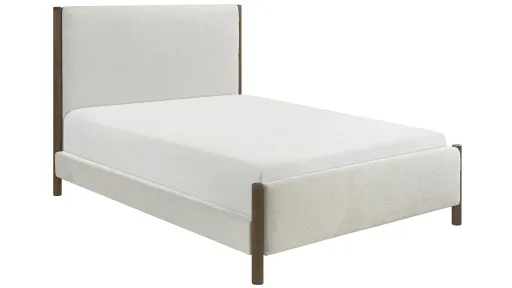 The Casslopeia Platform Bed utilizes color and texture to create a stylish bed option for your bedroom. The soft beige chenille fabric upholstery that covers the full headboard, footboard and rails is contrasted by the oak finished wood pilasters of the bed's four corners. The platform slat configuration allows for the use of a mattress only, eliminating the need for foundation support.