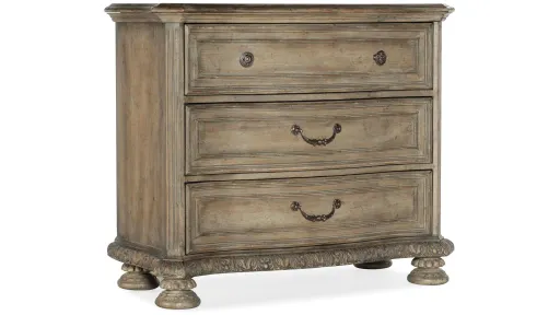 The Castella Bachelors Chest brings together classic style elements and a refined, rustic finish with the look of natural wood bathed in sunshine. Exuberant design motifs such as an acanthus leaf molding around the base, column motifs on the case and ornate bun feet infuse the piece with emotion. The Antique Slate finish in a beautiful patina, accented by knob-and-bail pull hardware in an antique silver finish, exudes a livable resort feeling for your interiors. Three drawers, including a cedar-lined bottom drawer and a removable felt liner for the top drawer. On the back is a convenient 3-plug outlet with USB port.