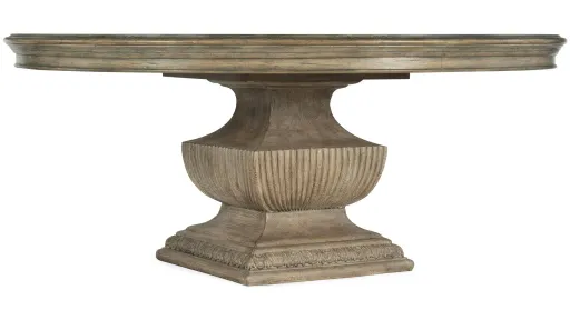 The stunning 60-inch Castella Round Dining Table brings together classic design elements, grand scale and a refined rustic finish with the look of natural wood bathed in sunshine to create a livable resort feeling for your dining setting. The classical urn-shaped base anchors the piece in old world charm, while the Antique Slate finish with a beautiful patina updates it for today's relaxed styles. Will seat up to six guests.
