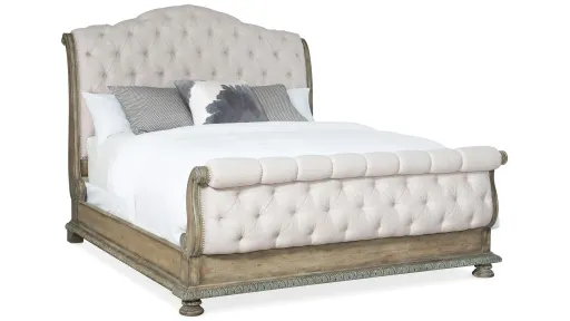 Grand scale and soft, sweeping lines infuse the statement Castella California King Tufted Bed with emotion. Upholstered in a beautifully woven multi-dimensional texture fabric in a creamy Natural Tan performance fabric with repeated tufting for a plush appearance, the bed is easily mixed with any color scheme. Acanthus leaf carving detail around the base of the bed adds the final touch of classic appeal to this over-the-top bed. Includes headboard, footboard and rails.