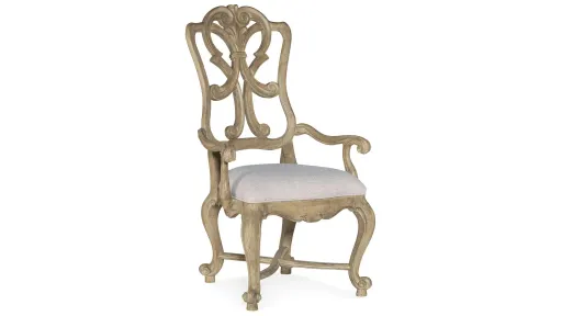 From the fleur-di-lis fretwork back to the scalloped apron to the curvaceous cabriole legs and X-stretcher, the Castella Wood Back Arm Chair is adorned with classic design details that make it a work of art. A neutral-colored performance fabric upholstery provides for hours of lingering comfortably at the table, while the Antique State finish has a beautiful patina and a look of laid-back luxury.