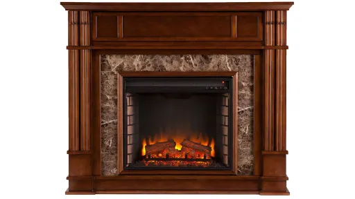 The Caufield media fireplace provides a linear woodwork encapsulates crisscross hatching of lifelike granite veneer. Designed as an entertainment console, beautifully convenient beneath a wall mounted TV; a recessed-door shelf hides the mass of media equipment.