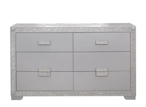 Introducing the Chalice Dresser, this spacious dresser exudes texture and glamour making it a must have focal point for your master suite. The dresser features six Drawers with glitter detailed Hardware allowing for easy access to the spacious Drawers. The silver finish and glitter accents completes the look. Put this together with the other case pieces (SOLD SEPARATELY) and your sleeping area will be an oasis of style. Mirror sold separately.
