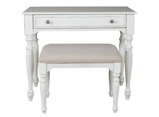 Make your space more functional with the Chandler Vanity Desk & Stool. Crafted with rubberwood solids and MDF in a white finish with brown rub through. Chandler includes a vanity and an upholstered stool. Featuring one full extension drawer, turned legs and block to tulip feet. A great piece for small spaces or between two twin beds for a nightstand.