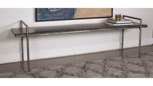 Chandos Wooden Bench a modern lodge styling, featuring a solid acacia wood seat with a live edge look stained in a dark gray with an organically textured iron frame finished in tarnished silver.