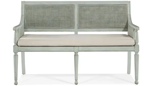A fresh take on vintage design, the charming Charleston Bench is crafted of wood and accented by cane on the back and inside and outside arms. Featuring intricately-shaped legs, the piece is finished in Haint Blue, a soft color which can be found on the ceilings of porches and entryways, window shutters and doors in the American South, dating back more than 200 years from the Gullah folklore that held the color kept "haints" or spirits from entering homes and dwellings. The cushion is upholstered in the Oyster performance fabric for stain resistance and cleanability.