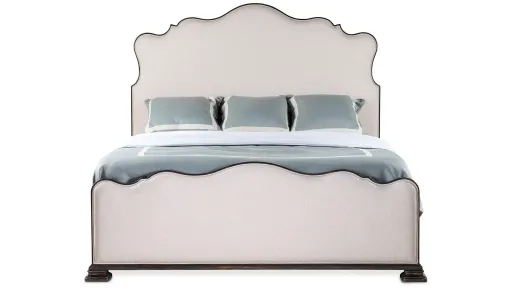 The stunning Charleston Upholstered Bed marries a traditional soul with a hint of cosmopolitan chic. Contrasting the rich Black Cherry heirloom finish on the wood trim, side panels and feet with the Chateau Linen upholstery on the scalloped-edge headboard and footboard, the bed is crafted of Cherry Veneers and fabric.