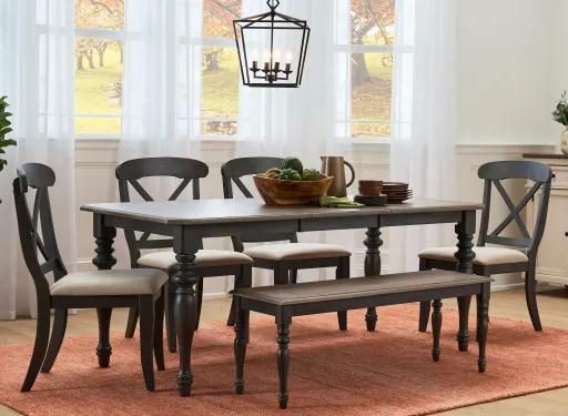 The Charleston 6-pc. dining set captures a modern yet classic look. The table features turned legs, bun feet and canted corners as well as an 18" extension leaf. The side chairs feature tapered legs, upholstered seats and a stylized X pattern on the backs. The bench features matching turned legs of the dining table and nylon chair glides to ensure your floors stay protected. Elegantly styled and casually proportioned Charleston works in a dining room as well as a kitchen dining combination.