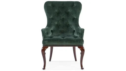Grand and gracious, the exquisitely-scaled fully-upholstered Charleston Host Chair (set of 2) features delicate button-tufting on the seat and back and is accented with bronze nailhead and welt trim along the seat bottom and outside arms and back. The expansive cabriole legs are finished in Maraschino Cherry using natural grain Cherry Veneers showcasing the dramatic cathedral structure with the selective inclusion of naturally-occurring knots to deliver a rich warm cherry finish and a smooth sophisticated aesthetic.