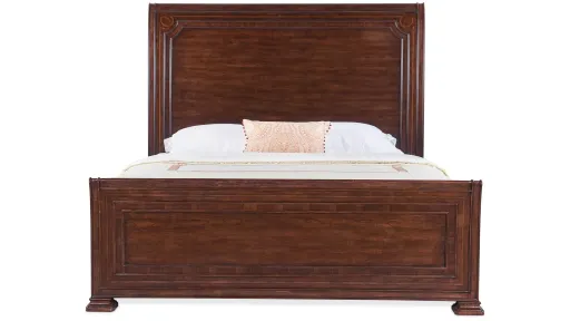 With the grandeur of a mansion bed in an updated silhouette, the Charleston Sleigh Bed is crafted of Cherry and Walnut Veneers with Maple and decorative Walnut inlay accents. Raised panels on the wood headboard and footboard and stepped block feet add designer appeal. The bed is finished in Maraschino Cherry using natural grain Cherry Veneers showcasing a dramatic cathedral structure with naturally occurring knots to deliver a rich warm finish and a smooth sophisticated aesthetic.