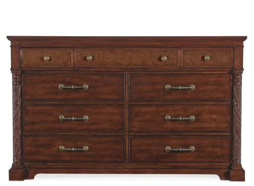 The tropical craftsmanship and botanical carving of the West Indies meets southern charm with the Charleston Nine-Drawer Dresser. Crafted of Cherry Veneers, Cane and Resin, the top three drawers have cane insets on the drawer fronts and removable felt liners inside. Front posts on either side have leaf motif carving. The center top drawer has a removable felt jewelry tray and the bottom two drawers are cedar-lined. The dresser is finished in Maraschino Cherry using natural grain Cherry Veneers showcasing a dramatic cathedral structure with naturally occurring knots to deliver a rich warm finish and a smooth sophisticated aesthetic. The round knob and bar pull hardware is finished in an antique bronze.