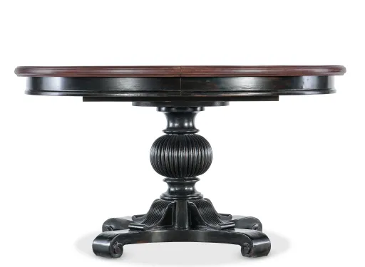 With a warm venerable beauty, the Charleston Pedestal Dining Table has an intricately carved pedestal base and a contrasting finish on the tabletop and base. Crafted of Cherry Veneers with Resin and a Solid-Wood Edge top, the base is in the vibrant Black Cherry patina with an heirloom quality. The tabletop is in Maraschino Cherry, using natural grain Cherry Veneers showcasing the dramatic cathedral structure with selective inclusion of naturally-occurring knots to deliver a rich warm cherry finish and a smooth sophisticated aesthetic. One 20-inch leaf extends the table to 74 inches long, allowing it to accommodate up to 8 coordinating chairs. Without the leaf, it accommodates up to 6 coordinating chairs.