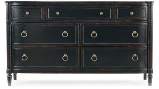 With an heirloom quality and elegant simplicity, the Charleston Seven-Drawer Chest is crafted of Cherry and Okoume Veneers, Walnut Inlay and Olive Ash Burl and has a Solid-Wood Edge top. Finished in a Black Cherry patina with subtle distressing, its slim legs have metal ferrules. The 7 self-closing drawers have cherry- colored interiors. The top 3 drawers have removable felt lines, the top middle drawer has a removable felt jewelry tray and the bottom two drawers have cedar-lined bottoms. Round knob and ring hardware feature antique bronze hardware.