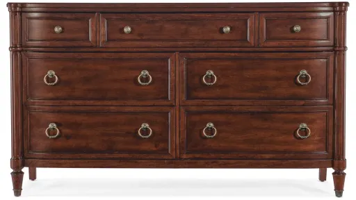 Celebrate the traditional soul and sophisticated beauty of Federal and Georgian design with this majestic Charleston Seven-Drawer Dresser. Crafted of Cherry and Okoume Veneers, Walnut Inlay and Olive Ash Burl with a Solid-Wood edge top, the rich wood veneer patterns, finished in the vibrant Maraschino Cherry, are exquisite. The 7 self-closing drawers have cherry-colored interiors. The top three drawers have removable felt liners, the top middle drawer has a removable felt jewelry tray and the bottom two drawers have cedar-lined bottoms.