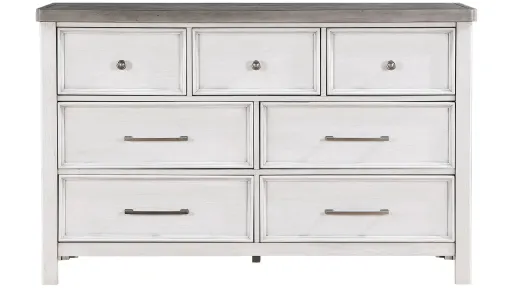 Hints of rustic styling permeate the transitional design of the Chesky Dresser, each subtle accent building to create a classic look for your bedroom. Antique white and gray finishes highlight the acacia veneer, their hues providing perfect complement to each other. The bar and knob hardware that fronts the drawers of the dresser are finished in antique pewter.
