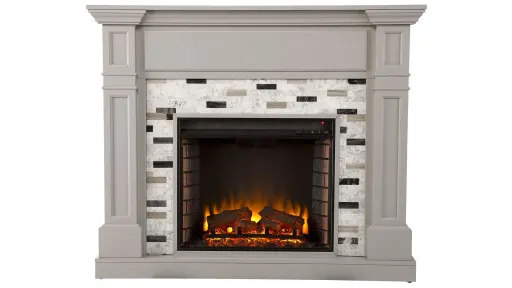 Warm up your space with contemporary design when you bring home this freestanding Chester Fireplace. Classic woodwork creates a cozy fireplace look, while the sleek marble surround adds a clean, modern feel to your living room or dining area. Realistic faux fire logs and flickering flames bring ambiance to your space, working with or without heat for year-round enjoyment. Curl up and unwind in cozy comfort when you add this marble fireplace to your contemporary decor. Do not place TV on Mantel.