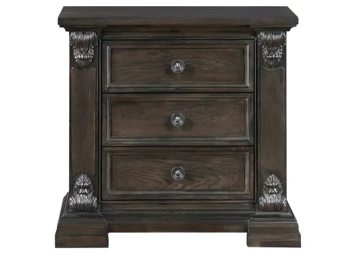 The elegant stature of the Cheswold Nightstand is solidified in its prominent placement in your bedroom. The nightstand features corbel accented pilasters, and traditional framing. An espresso-hued finish complements the oak veneer of the piece while flat black knob hardware fronts the drawers of the nightstand.