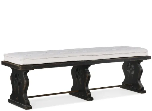 Add vintage elegance and extra seating to your dining table, the foot of your bed, your hallway or family room with this versatile Ciao Bella Bench. The unique harp-shaped legs form a beautiful base, along with a burnished brass stretcher. The exquisite black finish has multi-layered rub-through, giving the appearance it is aged gracefully through the decades. The lay-on cushion in Tuscan White is button tufted on one side with French Primitive tufting on the other side for comfort.