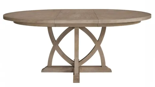 Citrus Heights Dining Table w/Leaf is a stunning addition to elevate your dining space with its blend of sophistication and comfort. Crafted with meticulous attention to detail, this table boasts a sand-colored finish that exudes warmth and refinement, while the mindi veneers enhance its natural beauty. Designed with versatility in mind, the 18" leaf extension effortlessly transforms this round table into an oval shape, allowing for ample seating and accommodating gatherings of all sizes with ease. Whether hosting intimate family dinners or entertaining guests, this table adapts to your needs with grace and style. The wire-brushed texture adds depth and character to the surface, enhancing the transitional Casual Elegance design that seamlessly blends modern simplicity with timeless charm. Its balanced proportions and clean lines create an inviting atmosphere, inviting conversation and fostering memorable dining experiences. Constructed to withstand the rigors of daily use, the Citrus Heights Round Table is as durable as it is aesthetically pleasing, promising years of enjoyment and functionality. Elevate your dining area with this exquisite piece that combines casual comfort with refined elegance, making every meal a moment to savor and cherish.