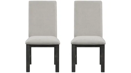 The transitional framing of the Clay Dining Chair will provide a mealtime platform for your casual dining room. The antique black finish of the collection's oak veneer creates a versatile decorative accent to your space. Gray fabric upholstery covers the seats and backs of the wood leg-supported side chairs.