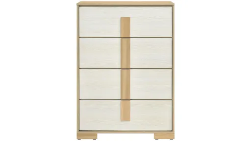Maximize your vertical storage with the stylish and functional modern Clayton Chest. This chest features a contemporary two-tone design, showcasing a warm natural wood grain frame contrasted by crisp white drawer fronts, adding a touch of modern elegance to your bedroom. Crafted from a durable combination of 3D paper, premium melamine board, wood, and engineered wood, it's built for lasting stability. The four spacious drawers glide smoothly on reliable ball-bearing glides, providing ample vertical storage without taking up too much floor space. Unique natural finished board handles add a sleek and integrated design element. The melamine laminate surface is designed to resist scratches and stains, ensuring the chest maintains its attractive appearance. Please note that assembly is required upon arrival.