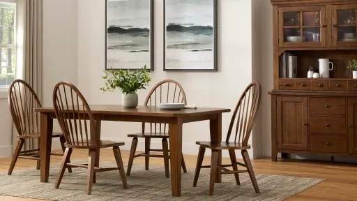 The Colebrook 5-pc. dining set embodies casual design at its finest. The plank tabletop and rustic oak finish have a country chic look that's enhanced by the bowed, spindle-back chair design. Plus, the two extension leaves make it easy to accommodate guests or large family dinners.