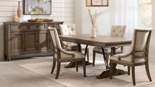 The Coventry 5-pc Dining Set is the stylish dining solution for any farmhouse style. This set features a dining table with extension leaf as well as upholstered side chairs for ultimate comfort.