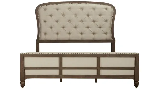 When details matter, choose the Coventry Shelter Bed. Crafted of poplar solids with white oak veneers, this bed features a wire brushed dusty taupe finish with worm hole distressing. The headboard features a softly shaped solid wood frame with a button tufted upholstered linen panel lined with nail head accents. The shelter footboard has an upholstered panel that wraps over the footboard frame with nail head accents and a deconstructed design that accents the exposed frame. With the bolt-on rails and a center support slat system, this bed is sure to last.