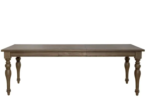 Crafted of poplar solids and white oak veneers, the Coventry Table features a wire brushed dusty taupe finish with wormhole distressing. This leg table has heavy turned legs and bead molding on the apron. There is an included 18" removable leaf that is unique as it is self-storing within the table when it is not needed. Coventry offers looks that work in today's homes with comfort abound.