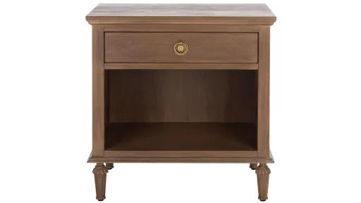 A must-have for today's classic-contemporary d_cor, this Daniella Nightstand emanates timeless French elegance. Daniella's turned and fluted legs flaunt subtle Rococo details that flourish in warm brown mahogany, pairing perfectly with the antiqued brass ring pull on its single drawer.