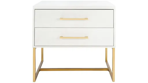 Alive with natural beauty and a dynamic modern pattern, this contemporary Devon nightstand brings _lan to any bedroom. Designed with a white finish and substantial brass metal hardware and legs, its generous two drawers make it as functional as it is stylish.