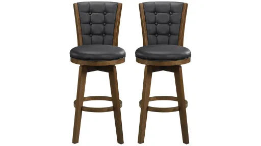 The Donovan Pub Height Swivel Stool is transitional style makes for a versatile seating option for your home. The 360-degree swivel seat allows you to fully engage with your surroundings. Meeting the needs of your tabletop height, the 29-inch bar-height chair allows for perfect placement within your casual dining space. The wood frame of the chair is finished in chestnut while the seat and button-tufted back are covered in black faux leather.