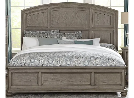 Transitional styling is paired with classic appointments and modern technology to create the Eastwood King bed. The eye-catching dramatic curved panel bed created instant appeal when taking in the design of this collection. The framing of the headboard carries over to the design of the footboard. A gray wire-brushed finish over oak veneers furthers the classic look of this bedroom collection.