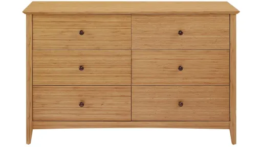 Beautifully crafted with solid bamboo, the Eco Ridge Willow Dresser features clean lines, beveled edges, and gently tapered legs to create a transitional dresser that compliments any style. The Willow Dresser features a solid reversed beveled top panel resting on a solid bamboo frame. The generous storage includes 6 solid built drawers, faced in solid bamboo, with user friendly ball bearing extension glides. Made in an ISO 14001 Environment Management certified facility, your purchase of this environmentally friendly bamboo product helps support forests and ecosystems worldwide. Crafted in solid bamboo it is earth friendly, and a sustainable resource.