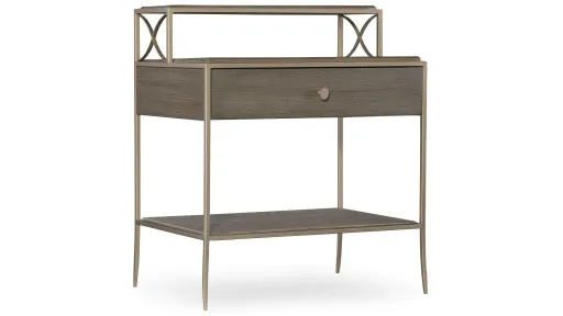 The delicately-scaled Elixir Leg Nightstand combines metal elements in a champagne silver finish with a soft gray finish applied to lightly sand-blasted walnut veneer for an organic and textured look. One drawer and two shelves. Faux shagreen is on the knob for a touch of intrigue.