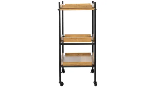 Roll the party into any room with the Elizabeth Bar Cart. Two spacious shelves organize glassware, bottles, and bar accessories, while the removable middle tray lets you take snacks and drinks right to your guests. Station in your kitchen as a coffee bar for brunch or roll into your living room to serve cocktails when entertaining family and friends. Delight guests at your next gathering with this mobile serving trolley.